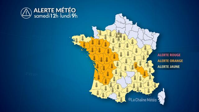 Une courte canicule est en place sur l'ouest de la France et la vallée du Rhône, où les seuils sont atteints. L'épisode de canicule se terminera entre dimanche soir et lundi sur de nombreux départements de l'ouest et du nord, mais se prolongera sur certains départements du sud et du couloir rhodanien la semaine prochaine.