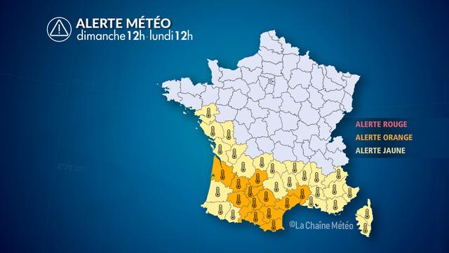La canicule marque un rebond pour ce week-end dans l'ouest et le sud du pays. Les températures les plus élevées sont situées entre l'Aquitaine et l'Occitanie avec des pointes à 41°C dimanche.