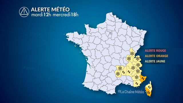 A l'opposé, de nouvelles précipitations remontent de Méditerranée sur le quart sud-est de la France de ce mardi après-midi à mercredi. Les pluies les plus fortes circulent entre les Alpes-Maritimes et la Corse. Des chutes de neige conséquentes sont attendues sur les Alpes du Sud et les Préalpes. On attend sur cet épisode de 36 h entre 40 et 80 mm de pluie, et de 30 à 50 cm de neige fraîche vers 1800 m d'altitude. Sur le Massif central, un refroidissement de la masse d'air se produit la nuit prochaine et la pluie se transforme en neige dès 600 m d'altitude sur l'est du Massif central. Il tombera 5 à 10 cm à 800 m d'altitude en Haute-Loire, Ardèche et Lozère, 15 à 20 cm à 1200 m d'altitude