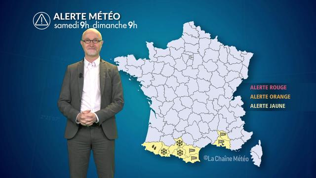 Cet après-midi : les chutes de neige deviennent plus modérées sur le relief pyrénéen avec une limite pluie-neige s'abaissant à 700-800 m. Mistral et tramontane soufflent en violentes rafales de 100 à 120 km/h sur la plaine du Roussillon et la basse vallée du Rhône.