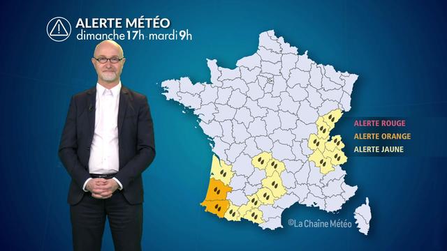 Dimanche soir, les pluies se renforcent graduellement entre les Pyrénées, l'ouest du Massif central, Rhône-Alpes jusqu’en Franche-Comté. La neige tombe sur le massif du Jura et le nord des Alpes au-de-dessus de 600 à 1000 mètres d'altitude selon les massifs.